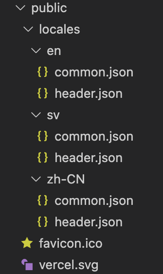 locales 디렉터리의 언어별 디렉터리의 이름은 next-i18next.config.js 파일의 locales 에 입력되는 문자열 배열의 항목들의 이름으로 디렉터리 이름을 결정합니다.