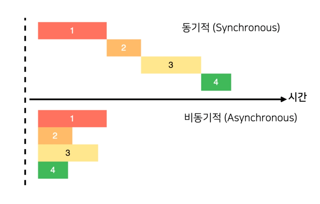 이렇게 특정 로직의 실행이 끝날 때까지 기다려주지 않고 나머지 코드를 먼저 실행하는 것이 비동기 처리입니다. 자바스크립트에서 비동기 처리가 필요한 이유를 생각해보면, 화면에서 서버로 데이터를 요청했을 때 서버가 언제 그 요청에 대한 응답을 줄지도 모르는데 마냥 다른 코드를 실행 안 하고 기다릴 순 없기 때문입니다. 위에선 간단한 요청 1개만 보냈는데 만약 100개 보낸다고 생각해보세요. 비동기 처리가 아니고 동기 처리라면 코드 실행하고 기다리고, 실행하고 기다리고.. 아마 웹 애플리케이션을 실행하는데 수십 분은 걸릴 겁니다.